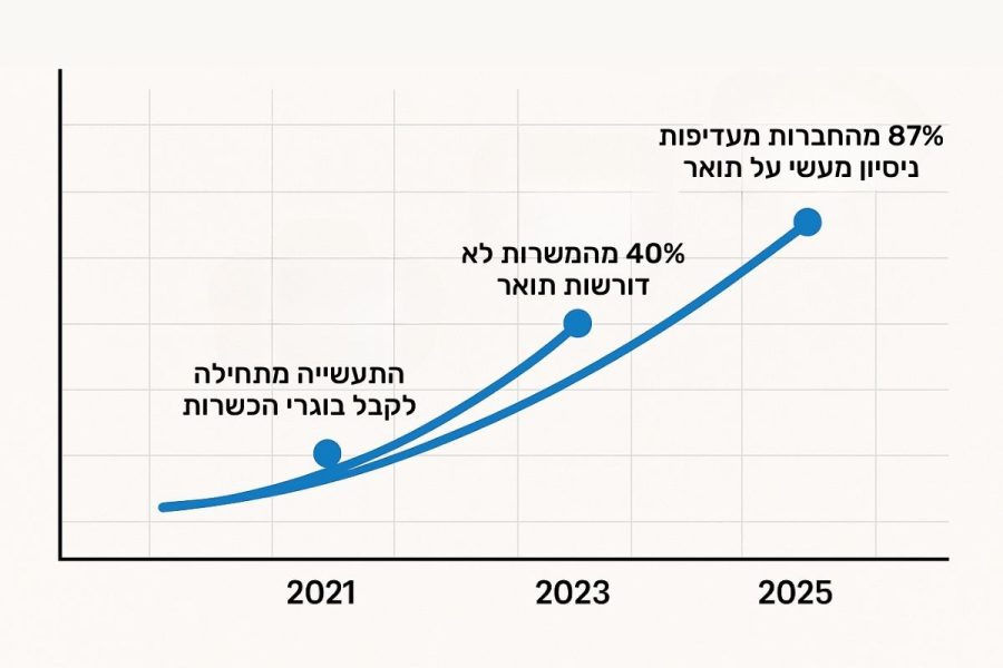 "בשנתיים האחרונות חל שינוי דרמטי בתפיסה של חברות ההייטק לגבי גיוס עובדים," מסביר אלון מזרחי, מנהל השמה בכיר בחברת טכנולוגיה מובילה. "היום אנחנו מחפשים אנשים עם יכולות מעשיות, ניסיון בפרויקטים אמיתיים והבנה עמוקה של הטכנולוגיות העדכניות ביותר – לא רק תעודה או תואר."